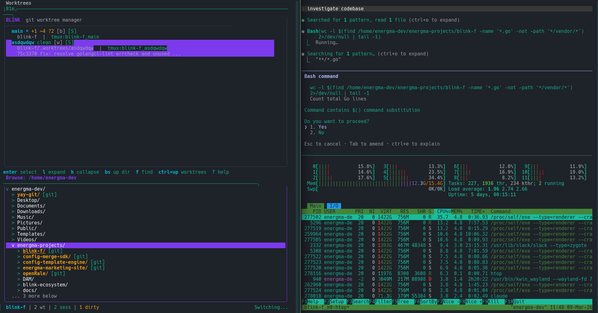 Instead of losing track across environments, we introduce Blink, a lightning-fast open-source TUI that makes managing git worktrees, tmux, sessions, and AI agents effortless. With a single keypress, developers can create or switch worktrees, launch their preferred AI coding tool, or commit and push changes.