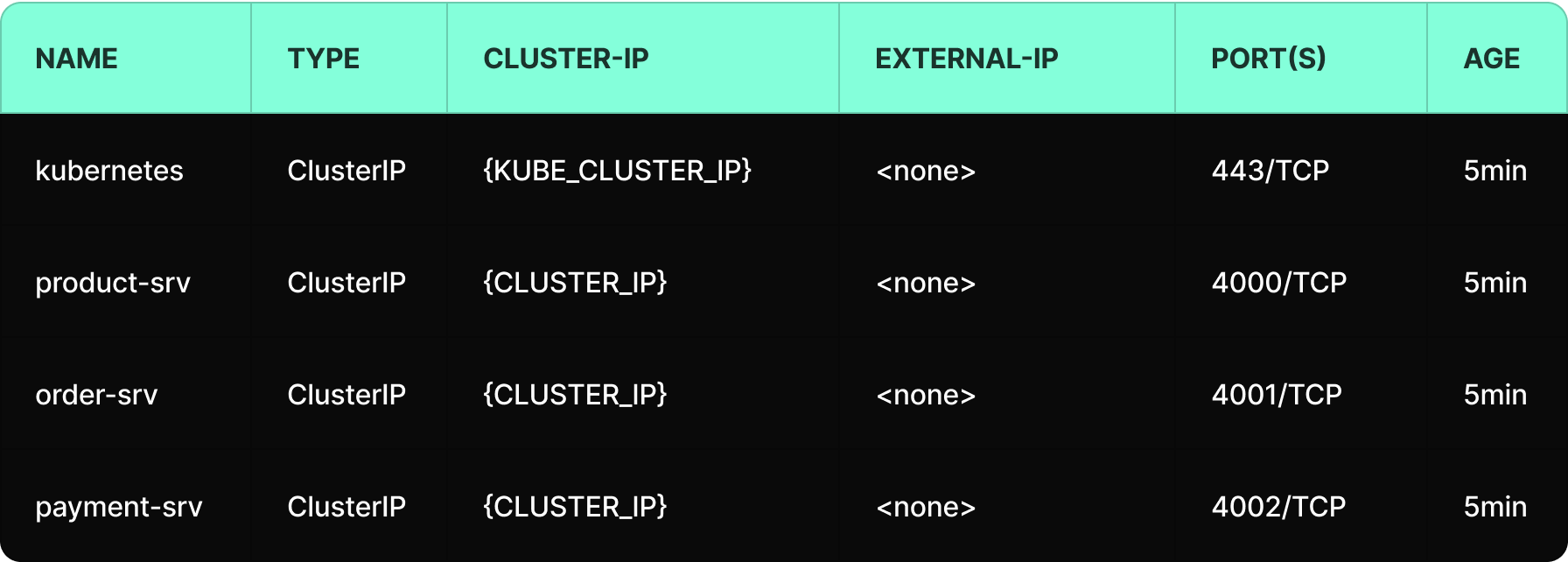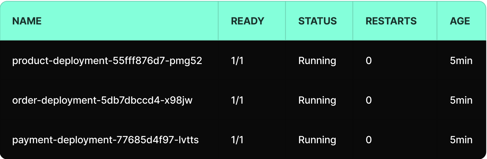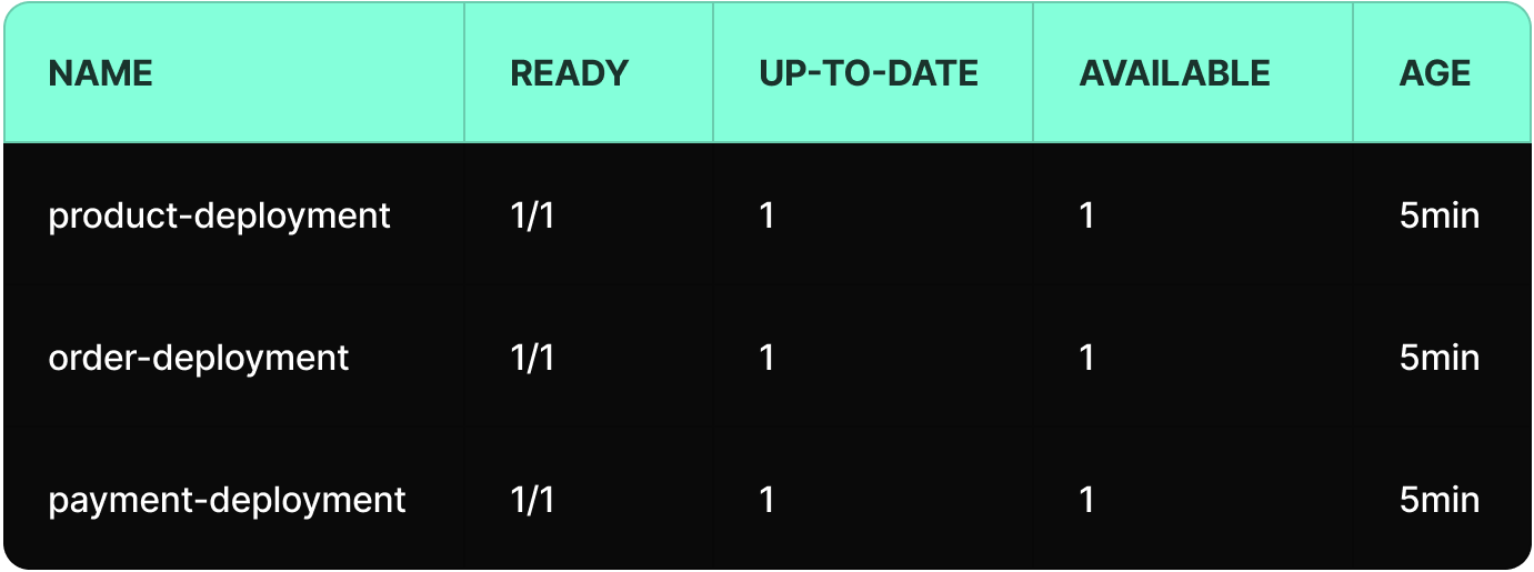 1kubectl apply -f deployment-product.yamlNote that we should repeat steps 2 and 3 to for Order and Payment services as well.